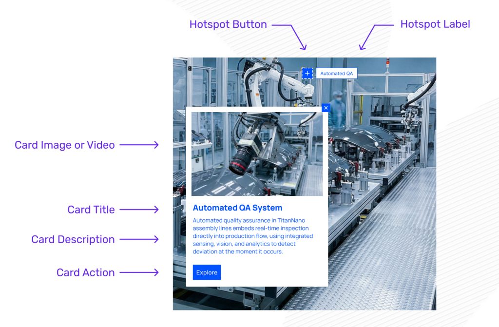 Hotspots allow you to add interactive touchpoints to an image, to highlight key features, open a card for further details, or link through to another page for more information.