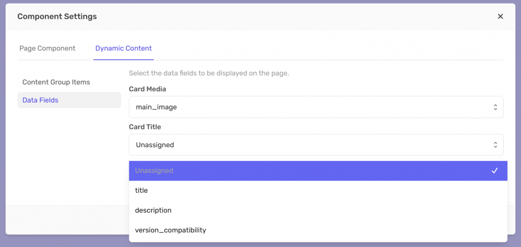 - Go to “Data Fields” and assign the data fields you want to display. Data fields are defined when creating a content group and control what appears on each card — such as the image, title, description, and any metadata you’ve applied.