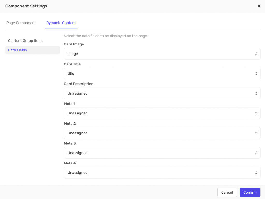 - Go to “Data Fields” and assign the data fields you want to display. Data fields are defined when creating a content group and control what appears on each card — such as the image, title, description, and any metadata you’ve applied.