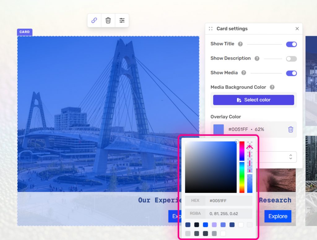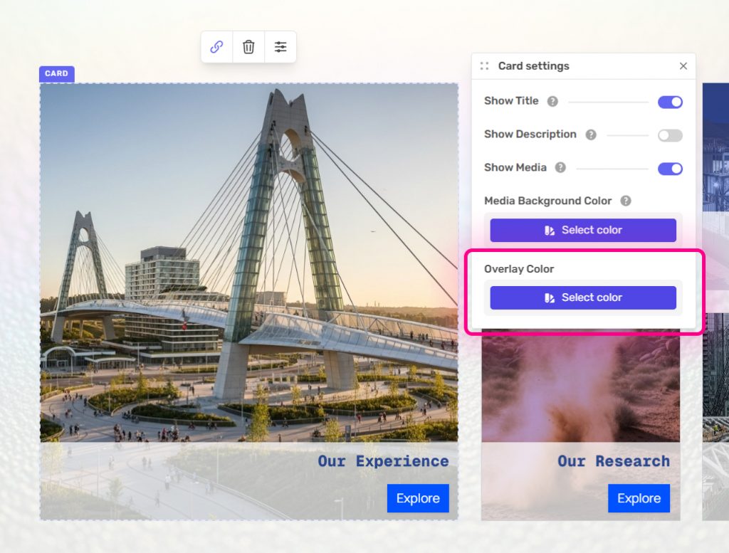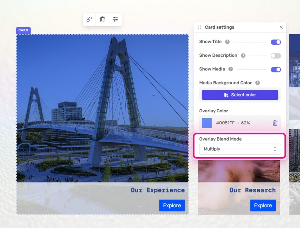 Each card on the Custom Grid can have an overlay added to the media. With the card selected, click on settings.