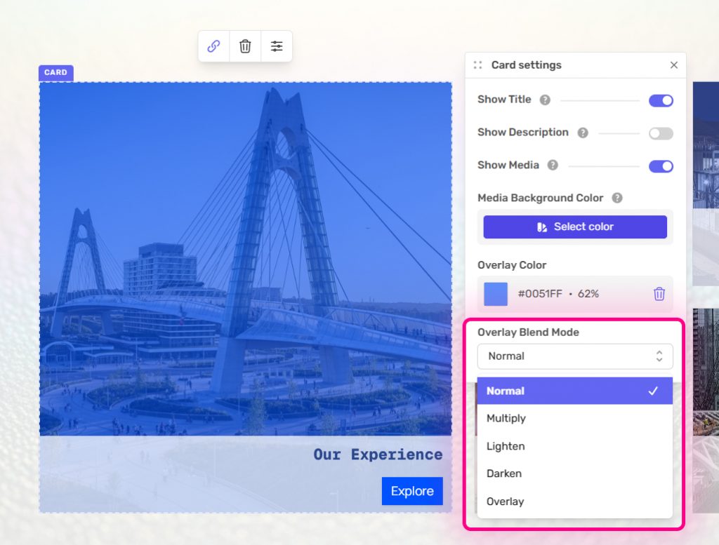 The blend mode will be automatically applied. You can control the strength by adjusting the opacity of the Overlay Color.